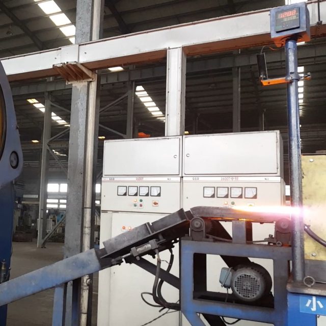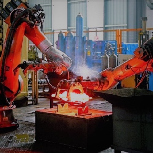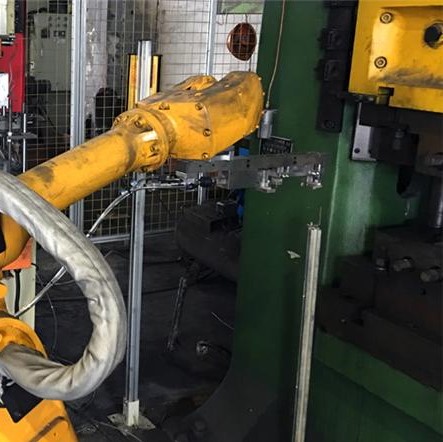 Robot-arm equipped production line can be assembled for small, medium and large parts. This production line is most efficient for sequentially fed dies and large-lot high-yield parts.
